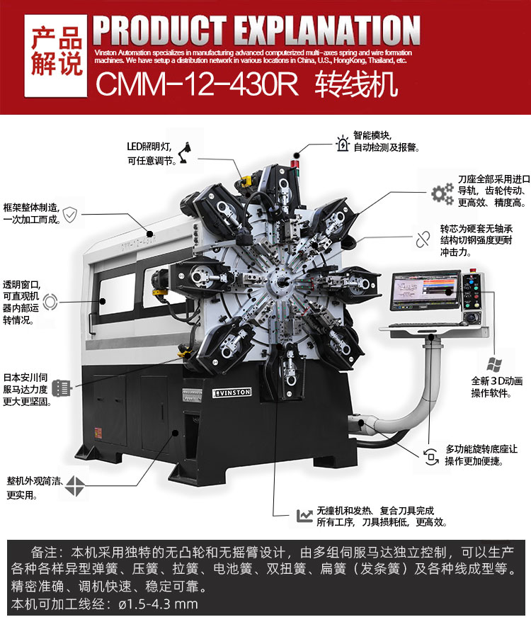 本机型适用于生产汽车、摩托车、自行车、线成型等车辆以及娱乐健身器材等产品所需的高精密弹簧产品