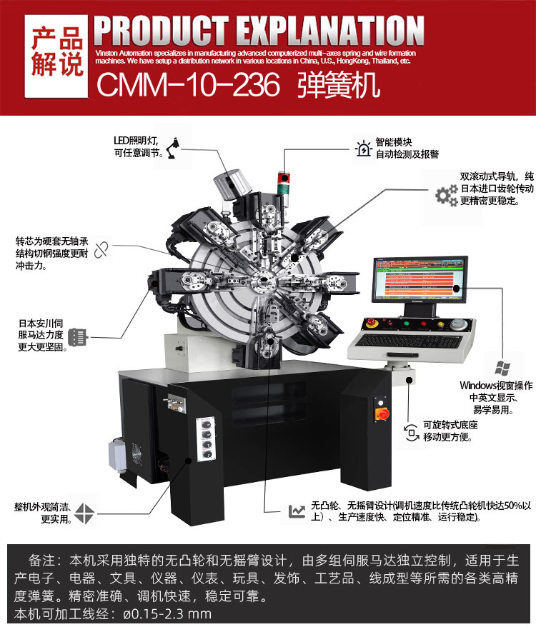 本机型适用于生产电子、电器、文具、仪器、玩具、发饰、工艺品、线成型等高难度精密弹簧。