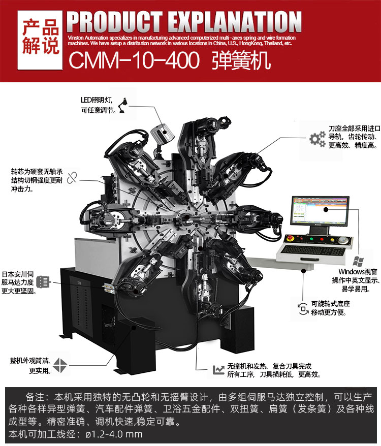 本机型适用于生产汽车、摩托车、自行车等车辆及娱乐健身器材所需的高精密弹簧的生产。