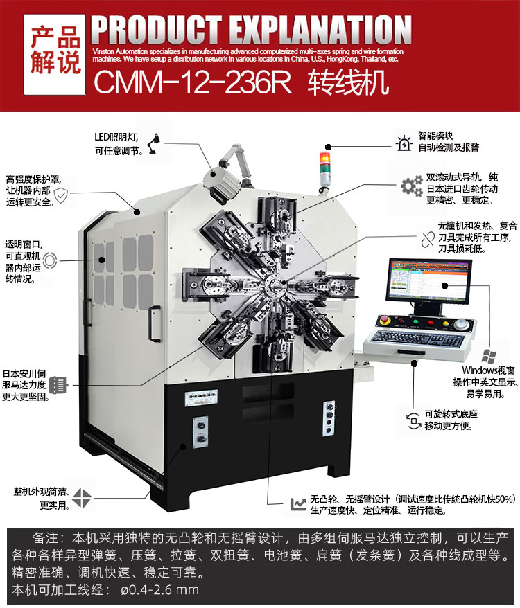 本机型适用于生产电子、电器、文具、仪器、玩具、发饰、工艺品、线成型等高难度精密弹簧,尤其针对各种内(外)双扭簧特别适合。