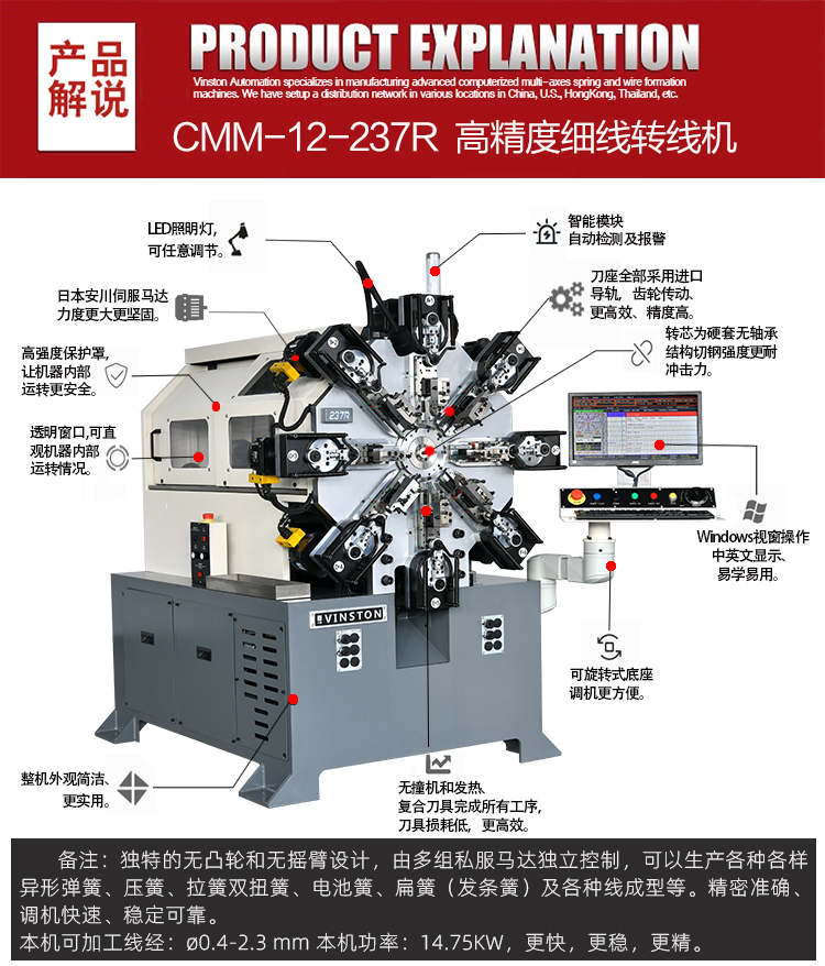 本机型适用于生产电子、电器、文具、仪器、仪表、玩具、发饰、工艺品、线成形等高难度高精密弹簧,尤其针对各种内(外)双扭簧特别适合。